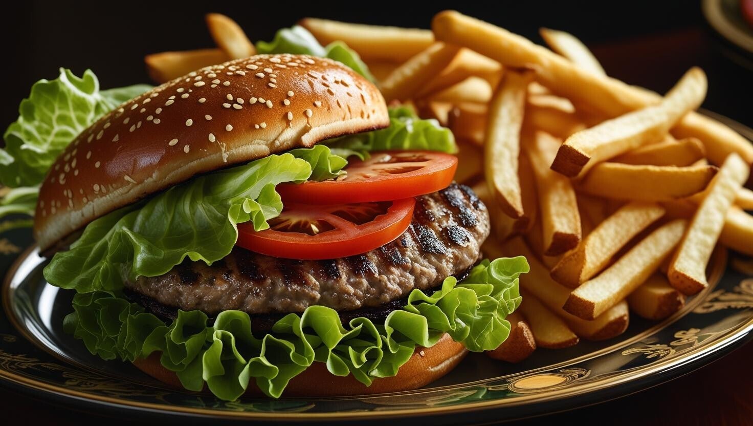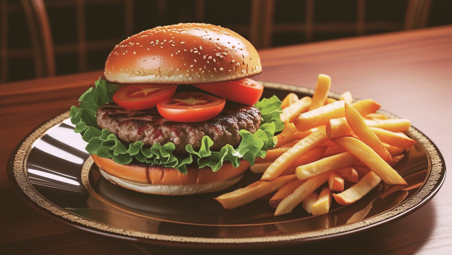 Hamburger, plate, dark background formal, great for menu, with fries, red and brown and no background photos.